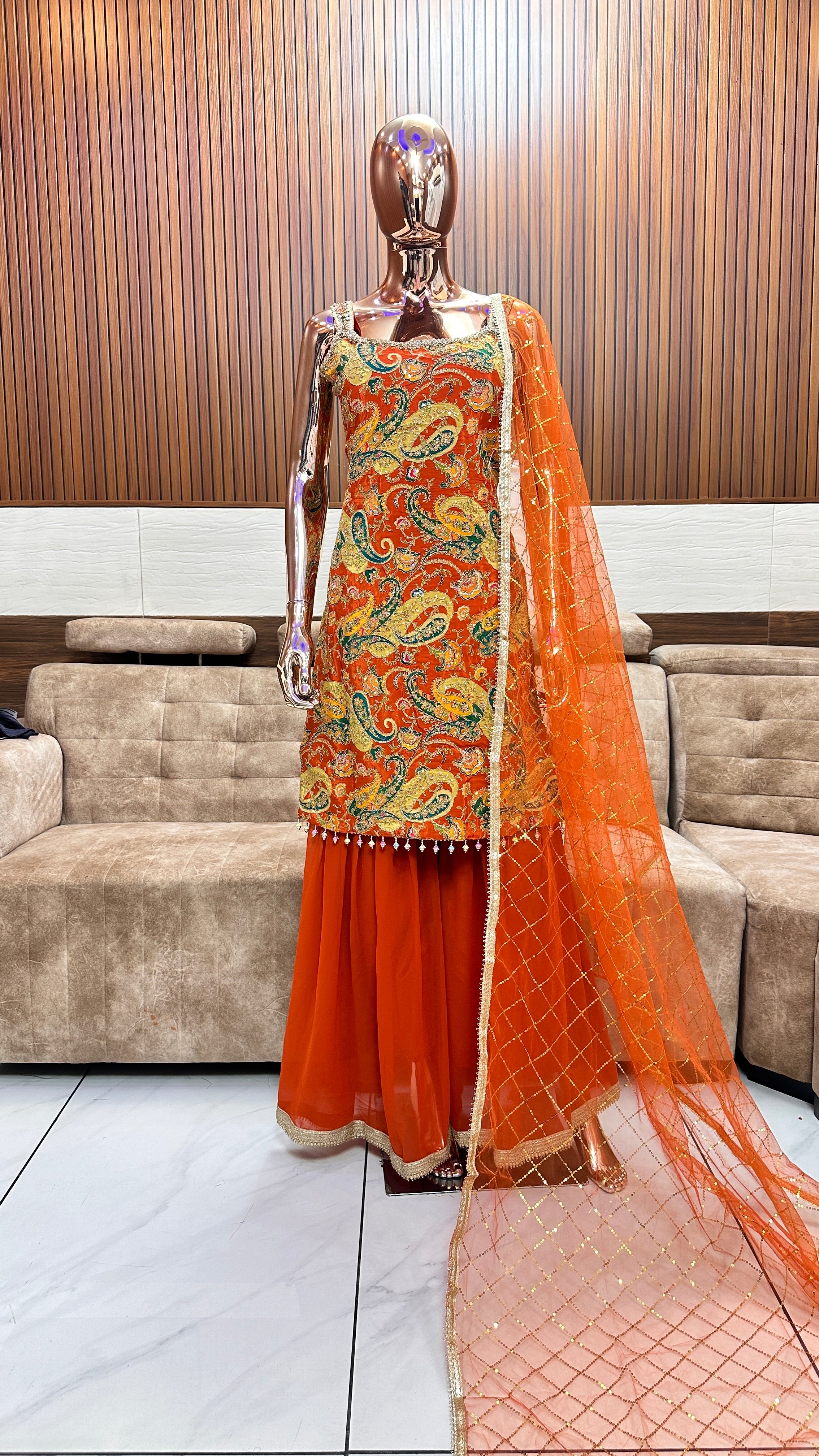 This stunning traditional ensemble features a vibrant orange kurta with intricate paisley embroidery in gold and green hues, paired with a matching net dupatta adorned with delicate golden accents. The kurta is embellished with small pearl-like tassels at the hem, adding a touch of elegance. The flowing palazzo pants in orange chiffon complete the look, creating a graceful and festive outfit perfect for special occasions or cultural events. The overall design blends classic charm with modern vibrancy, making it a standout piece in any wardrobe.